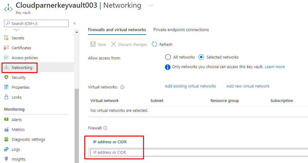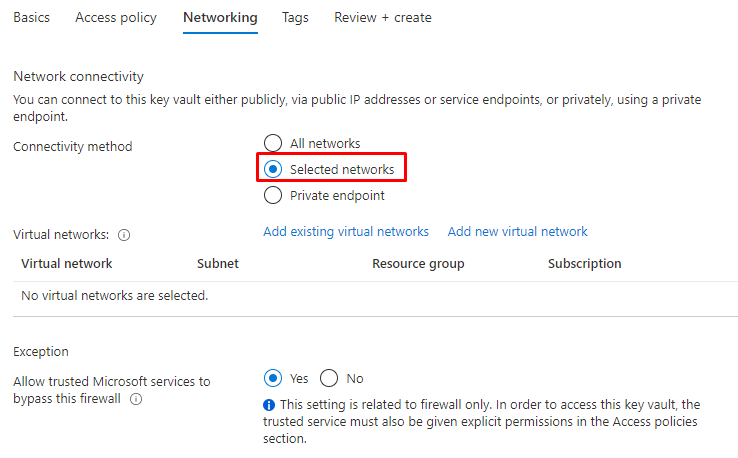 - When using firewall with AKV, you must enable option Allow trusted Microsoft services to bypass the firewall.