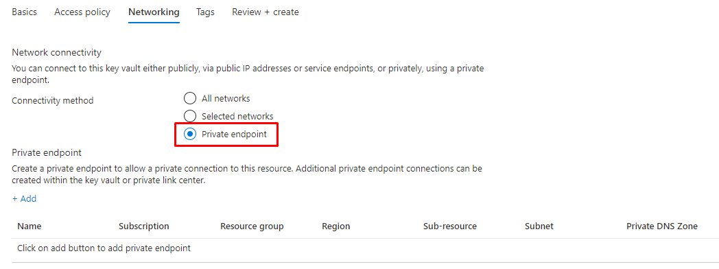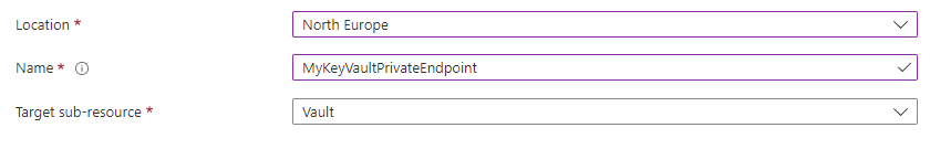 When you start creating a Private endpoint, you will choose a location, name and Target Sub-resource, in this case it will be Vault. Microsoft is using service tags for these. They will allow you to access service under tag and you don't specify any IP-addresses.