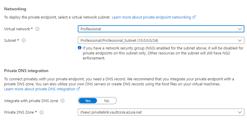 Only private DNS zones in the currently selected subscription with name 'privatelink.vaultcore.azure.net' will be shown. Using a private DNS zone in the same resource group as the virtual network is recommended, and if there are no existing zones that meet this criteria, one will be created.