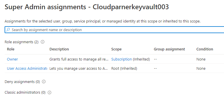 From View my access you will see the default access your accounts has. My account example has Owner that is Inherited from subscription level and because I have PIM Enabled, there is also User Access Administrator permissions