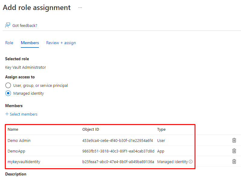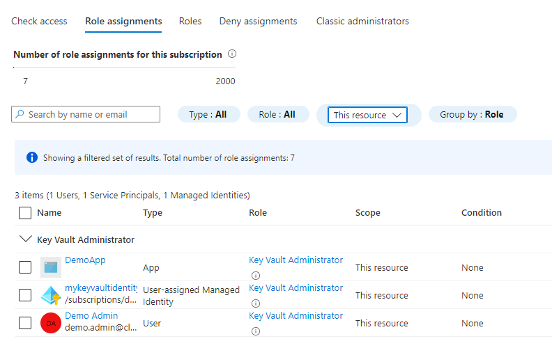 - Application-only: The application represents a service principal or managed identity. This identity is the most common scenario for applications that periodically need to access certificates, keys, or secrets from the key vault. For this scenario to work, the