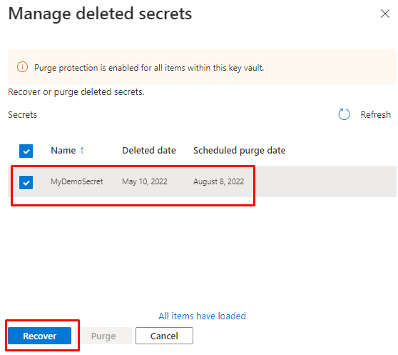 To enforce a mandatory retention period and prevent the permanent deletion of key vaults or secrets prior to the retention period elapsing, you can turn on purge protection. When purge protection is enabled, secrets cannot be purged by users or by Microsoft.