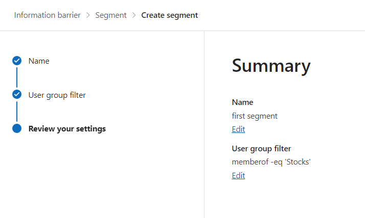 - The Review your settings page provides an overview of your segment configuration. Review the details and any suggestions or warnings presented.