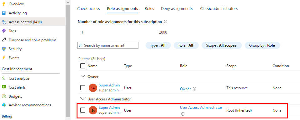 When you go to see your subscription, you will a User Access Administrator role that is inherited.