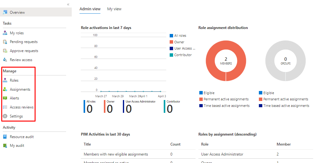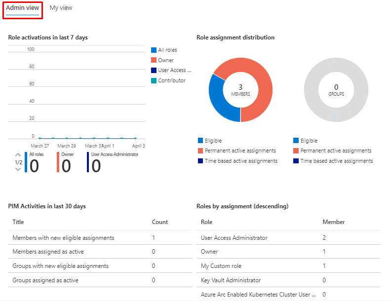 | Azure resources | Displays a dashboard and settings for Privileged role administrators to manage Azure resource role assignments. This dashboard is disabled for anyone who isn't a privileged role administrator. These users have access to a special dashboard titled My view. The My view dashboard only displays information about the user accessing the dashboard, not the entire organization. |