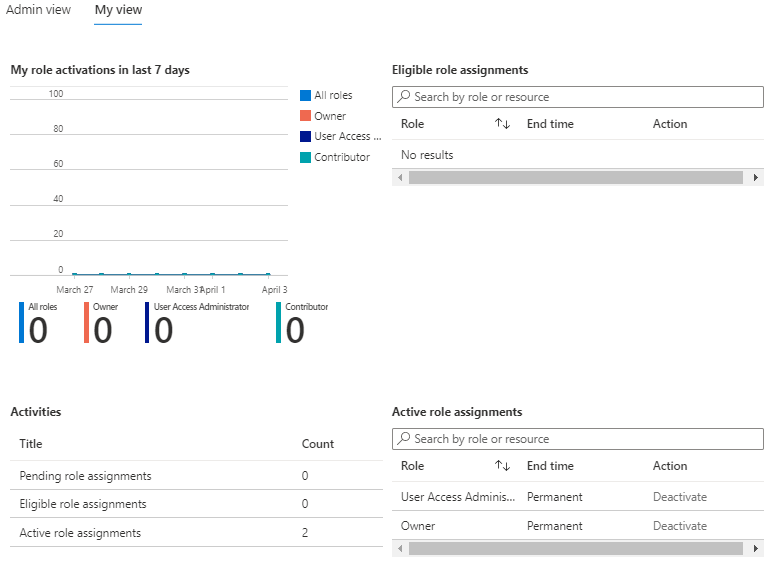 | Pending requests | Displays your pending requests to activate eligible role assignments. |