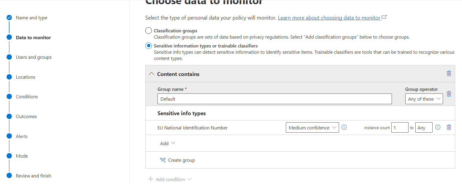 | Custom Data Transfer Policy | Create a tailored policy by defining data types, user groups, locations, transfer conditions, and notification preferences. | 1. Go to Microsoft Purview compliance portal. 2. Navigate to Priva Privacy Risk Management > Policies. 3. Click "Create a policy" and select "Custom". 4. Choose "Data Transfers" template and enter a policy name (optional description). 5. On "Data to monitor" page, select data types (classification groups or individual types). 6. On "Users and groups" page, define who the policy applies to (all users/groups or specific ones). 7. On "Locations" page, choose locations to scan (Exchange, OneDrive, SharePoint, Teams). 8. On "Conditions" page, select data transfer types to detect (outside org, across regions, between users/groups/sites). 9. On "Outcomes" page, choose user notification methods (Teams tips, email with remediation steps and training link). 10. On "Alerts" page, configure admin alerts (frequency, thresholds, severity). 11. On "Mode" page, choose "Test it out first" or "Turn it on right away". 12. Review settings and select "Submit" to create the policy. |