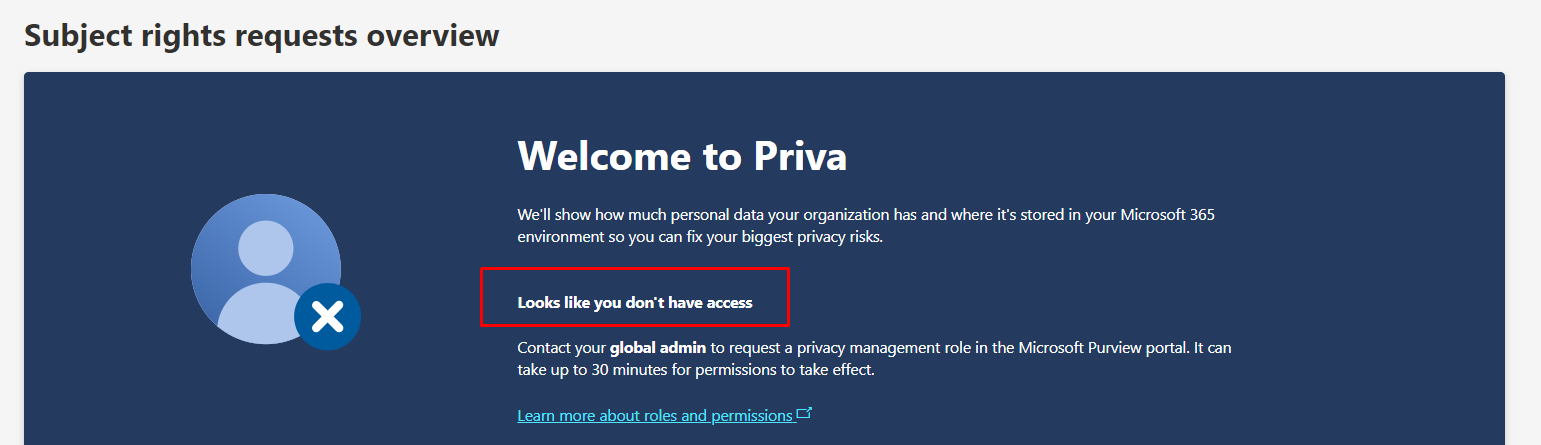 | Privacy Management Viewer | Members can view analytical information in Priva; for example, the Overview page, Data profile page, and subject rights request reports. | Privacy Management Viewer |