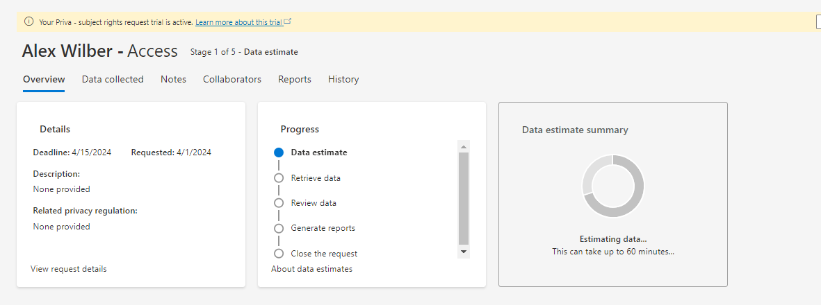 - Data Estimate: - Priva analyzes the request and estimates the amount of relevant data.