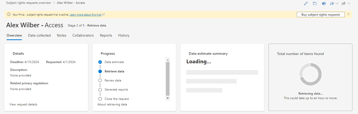 - Reviewing Data: Collaborators examine collected data, identify relevant items, and perform actions like redacting content. (See Reviewing Data for a Subject Rights Request for details).