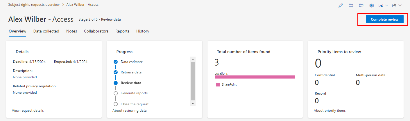 - Review Data: - Collaborators examine the collected data and identify items related to the request.