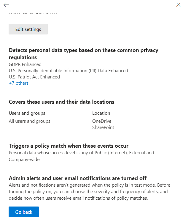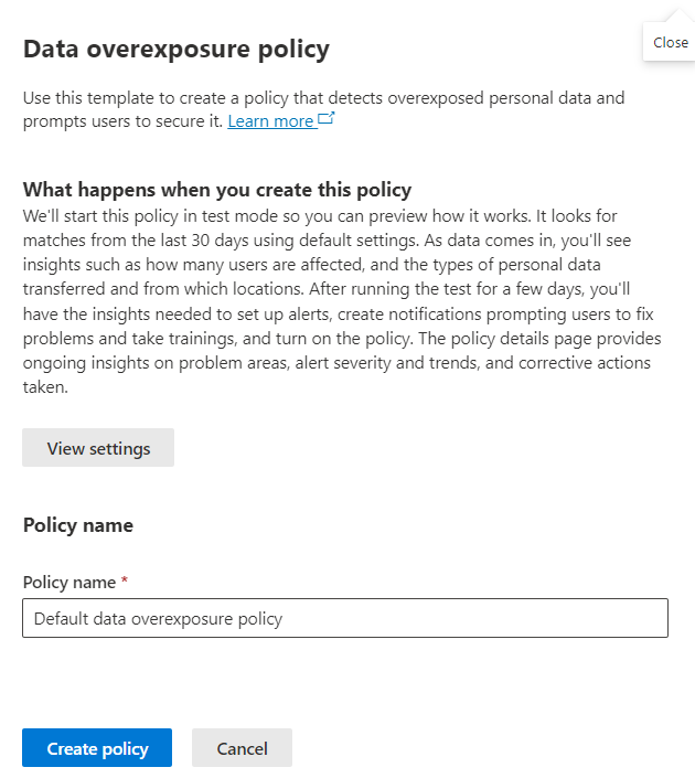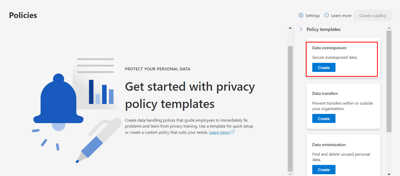 | Default Data Overexposure Policy | Identifies personal data with overly broad access levels (Public, External, Internal) in OneDrive or SharePoint. | 1. Go to Microsoft Purview compliance portal. 2. Navigate to Priva Privacy Risk Management > Policies. 3. Click "Create a policy". 4. Select "Data Overexposure" and "Create". 5. (Optional) Review default settings. 6. Enter a descriptive policy name and select "Create policy". |