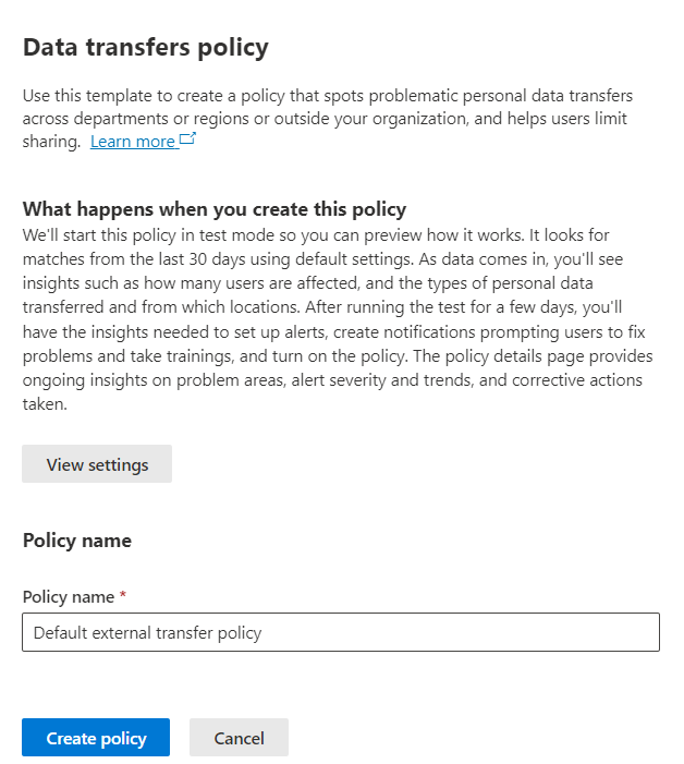 | Default Data Transfer Policy | Identifies personal data transfers outside your organization (emails, OneDrive/SharePoint links or file movement, Teams chats). | 1. Go to Microsoft Purview compliance portal. 2. Navigate to Priva Privacy Risk Management > Policies. 3. Click "Create a policy". 4. Select "Data Transfers" and "Create". 5. (Optional) Review default settings. 6. Enter a descriptive policy name and select "Create policy". |