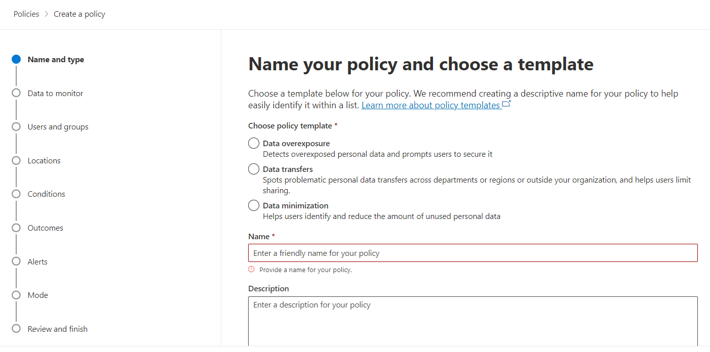 | Selecting Policy Templates | Choose pre-built templates to address your most pressing data privacy concerns. | Data Overexposure: Identifies content with personal data at risk of unauthorized access. Data Transfers: Monitors and restricts personal data movement across departments, regions, or outside your organization. Data Minimization: Detects and helps eliminate unused personal data stored in your systems. |