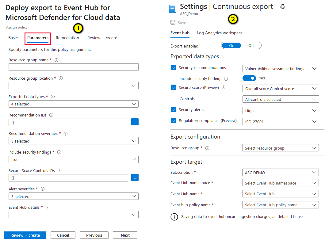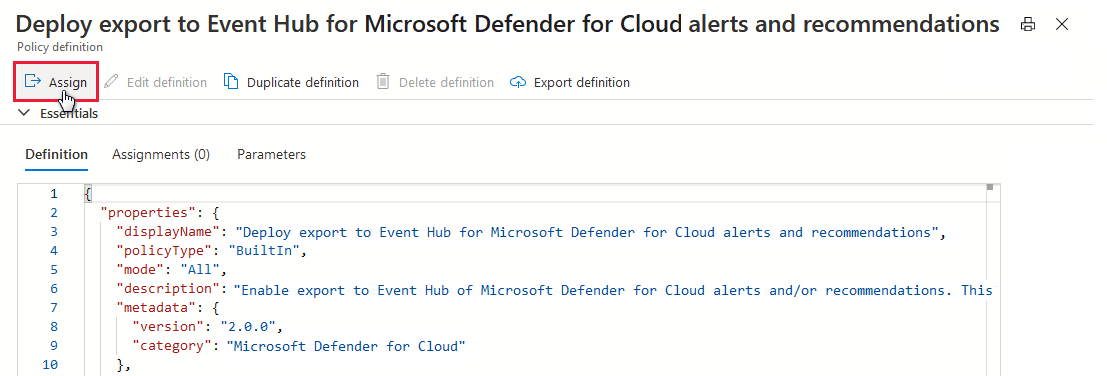 | Continuous export to Event Hub | Deploy export to Event Hub for Microsoft Defender for Cloud alerts and recommendations | cdfcce10-4578-4ecd-9703-530938e4abcb |