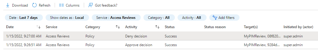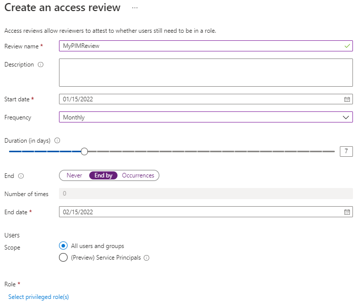 | Azure AD role | Specified reviewers Self-review | Azure AD PIM | Azure portal |