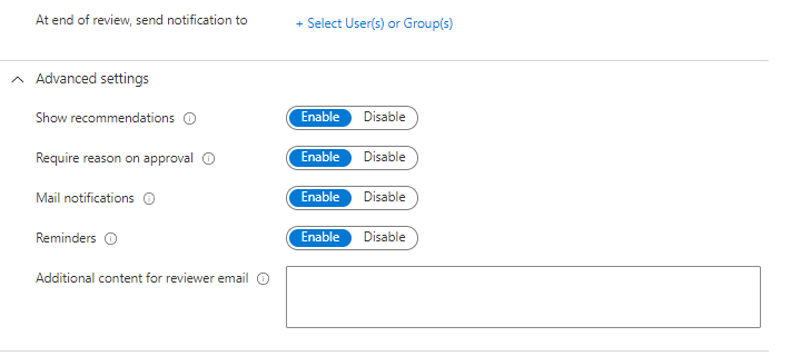 Mail notifications: Azure AD to send emails to reviewers when an access review starts, and to the review owner when a review completes