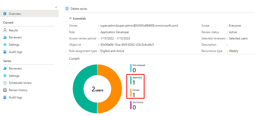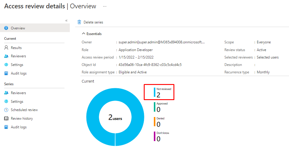 When You open the review, You will see statistics for the review. In my example I have 2 users in the Application Developer role that have to reviewed.