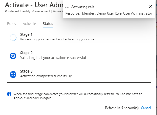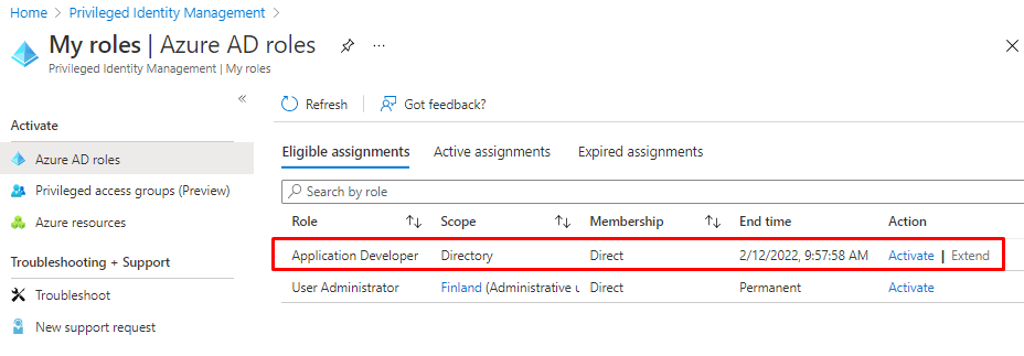 | Pending requests | Displays your pending requests to activate eligible role assignments. |