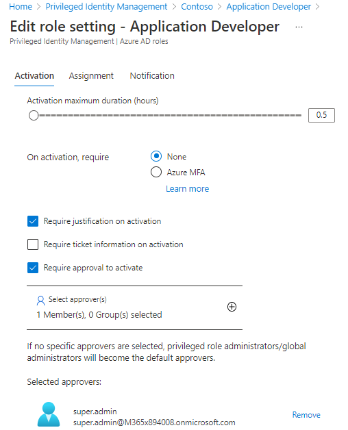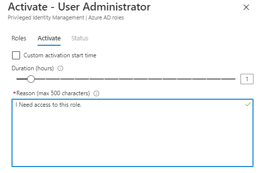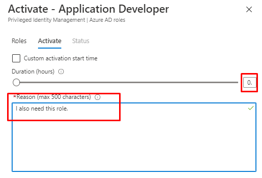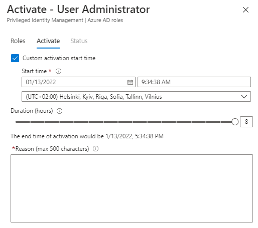 And we are back in business. Now You have to give a reason why You want this role and You can also give a Custom activation time and a duration for the role to be active.