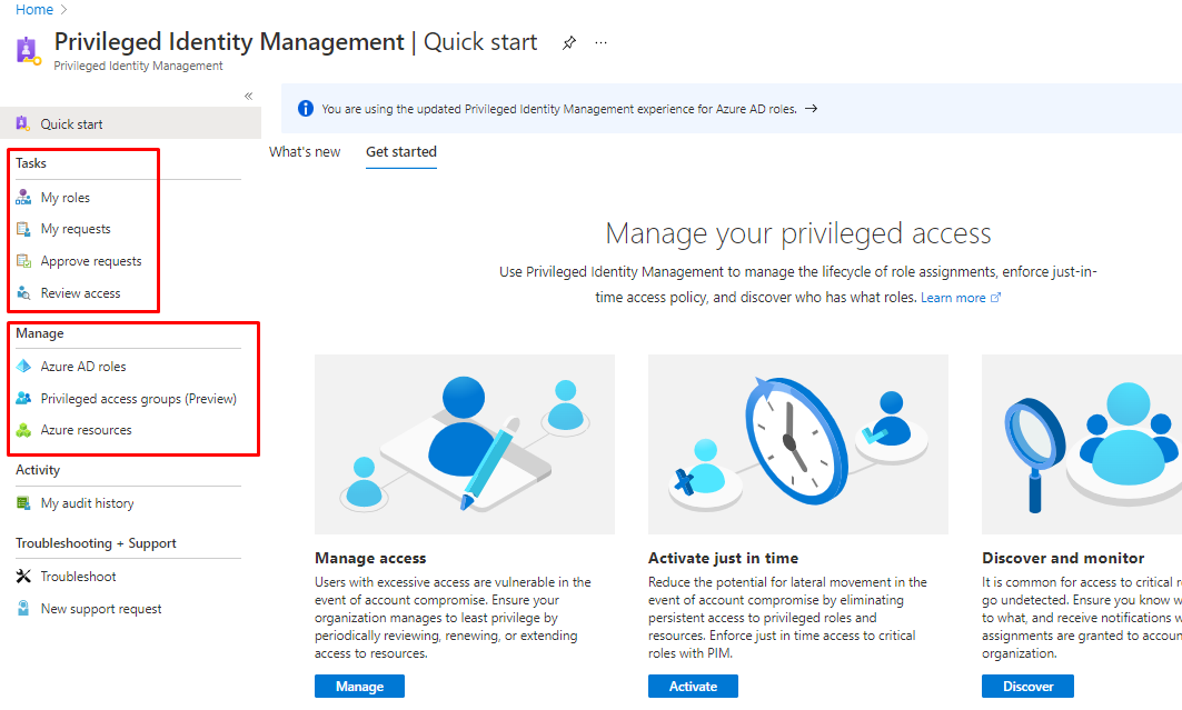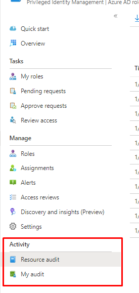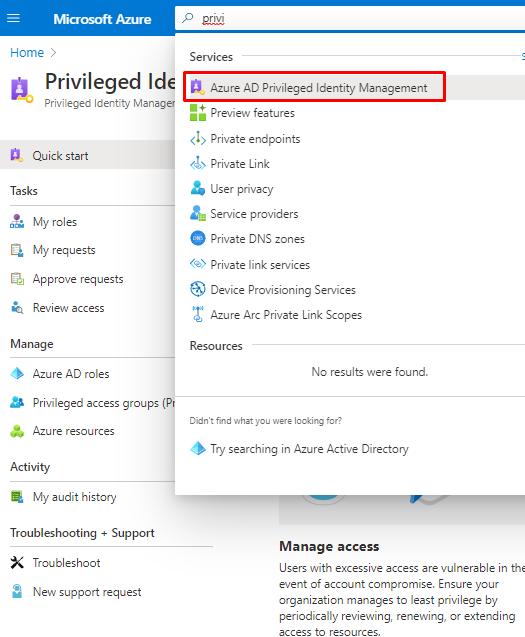| Azure resources | Displays a dashboard and settings for Privileged role administrators to manage Azure resource role assignments. This dashboard is disabled for anyone who isn't a privileged role administrator. These users have access to a special dashboard titled My view. The My view dashboard only displays information about the user accessing the dashboard, not the entire organization. |