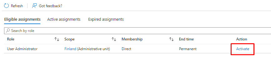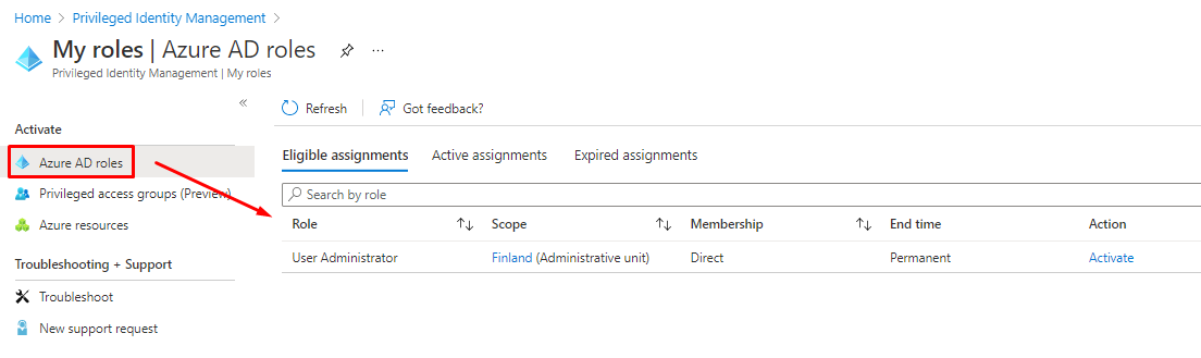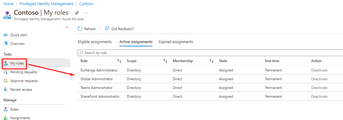 | My roles | Displays a list of eligible and active roles assigned to you. This is where you can activate any assigned eligible roles. |
