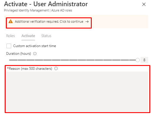 When the User wanting to active the Eligible role select "Activate" they will be presented with the following. But wait, what is the Additional verification required?
