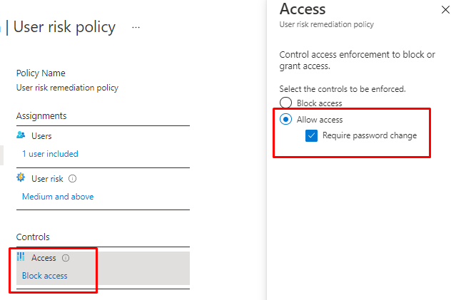 After Your specified User risk level is reached, You can specify to block login, allow login and allow login and force password change.
