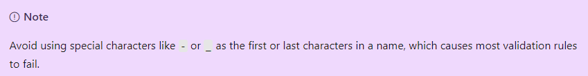 | Entity | Scope | Length | Casing | Valid characters | Suggested pattern | Example |