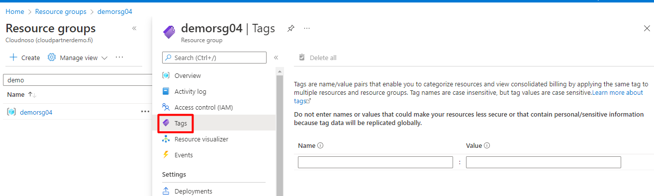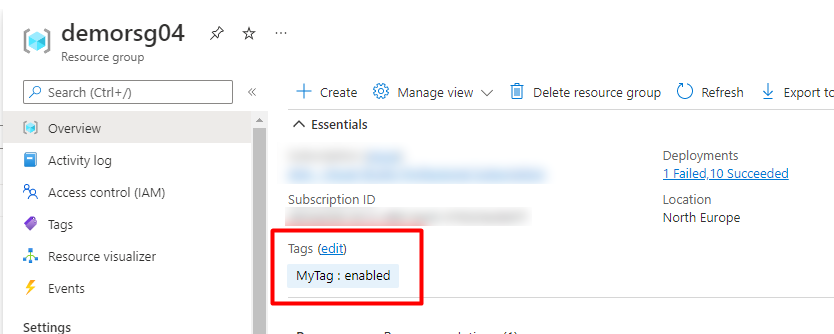 In example open a resource group and add a tag.
