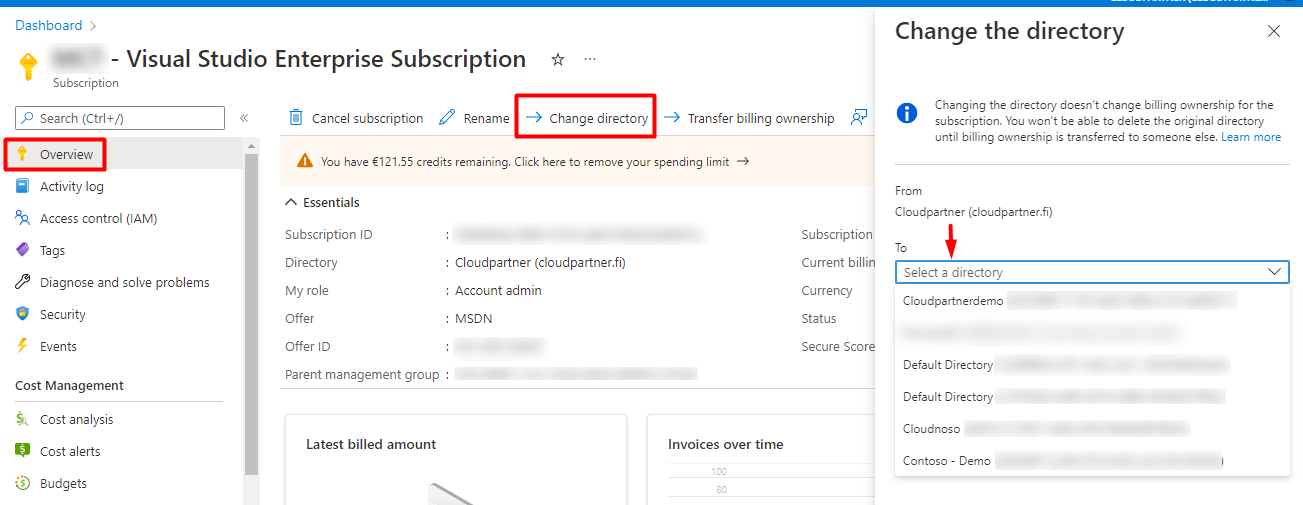 - For more information, see Transfer an Azure subscription to a different Azure AD directory.