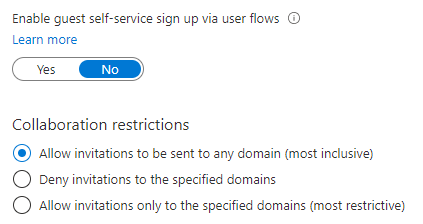 Yes means that you can enable self-service sign up for guests via user flows associated with applications in your directory. No means that applications cannot be enabled for self-service sign up by guests and require them to be invited to your directory.