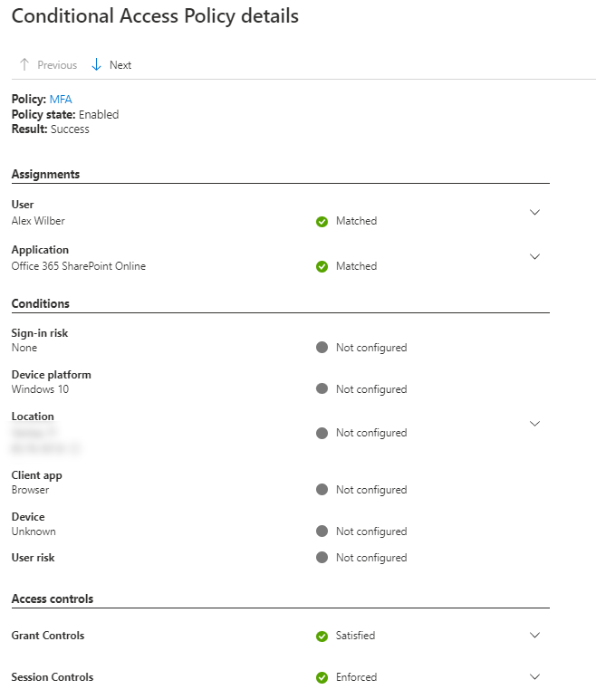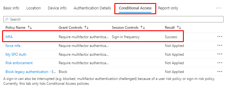 And the Conditional access policy user has triggered and the result of the policy