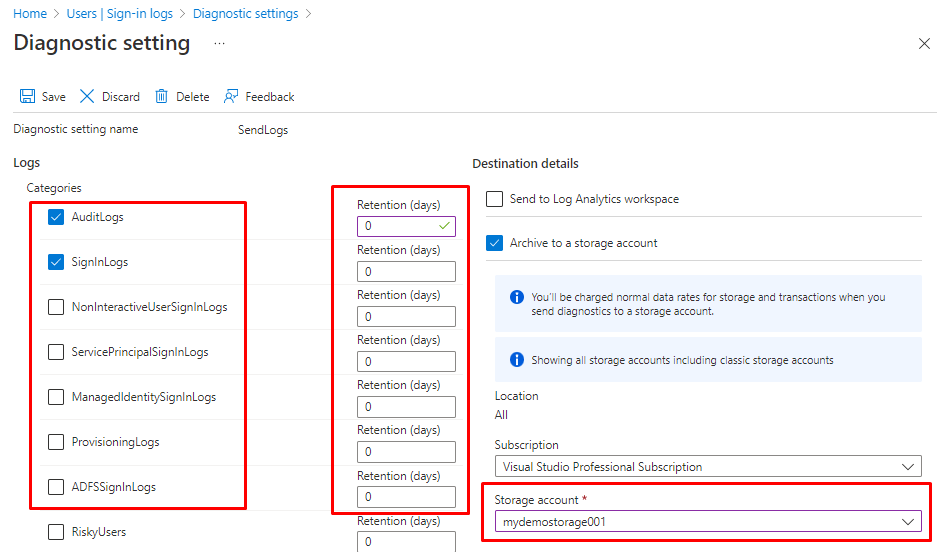 | Storage account | Don't use an existing storage account that has other, non-monitoring data stored in it so that you can better control access to the data. If you're archiving the activity log and resource logs together, you might choose to use the same storage account to keep all monitoring data in a central location. To send the data to immutable storage, set the immutable policy for the storage account as described in Set and manage immutability policies for Azure Blob Storage. You must follow all steps in this linked article including enabling protected append blobs writes. The storage account needs to be in the same region as the resource being monitored if the resource is regional. Diagnostic settings can't access storage accounts when virtual networks are enabled. You must enable Allow trusted Microsoft services to bypass this firewall setting in storage accounts so that the Azure Monitor diagnostic settings service is granted access to your storage account. Azure DNS zone endpoints (preview) and Azure Premium LRS (locally redundant storage) storage accounts are not supported as a log or metric destination. |