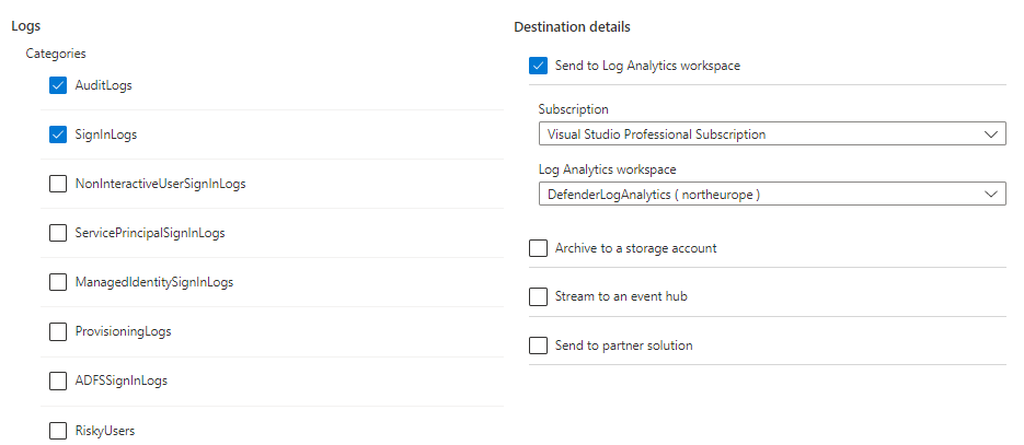 You can also use Storage account to retain the logs, you can select what logs are needed and the retention amount in days.