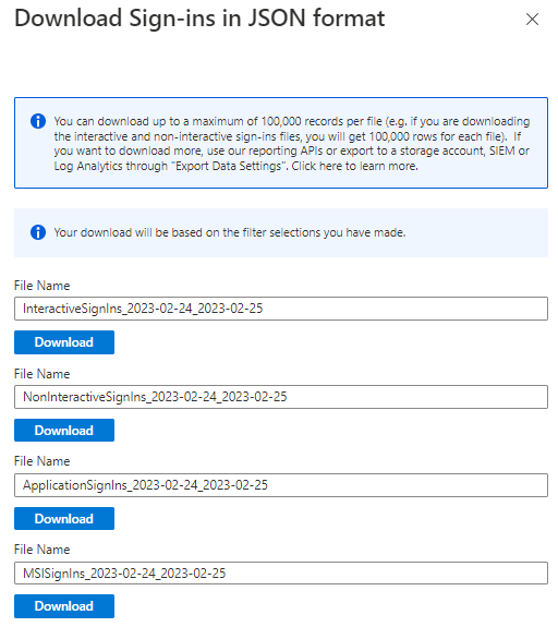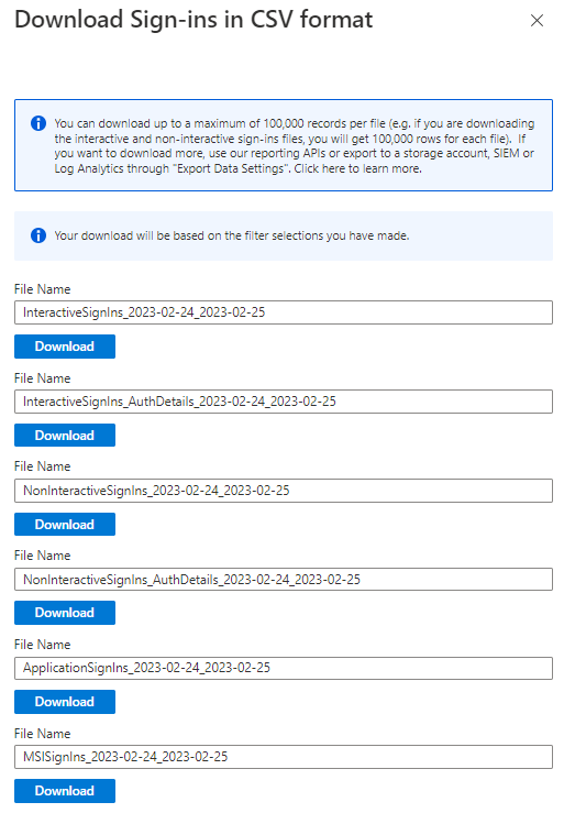 The risky users and risky sign-ins reports allow for downloading the most recent 2500 entries, while the risk detections report allows for downloading the most recent 5000 records.