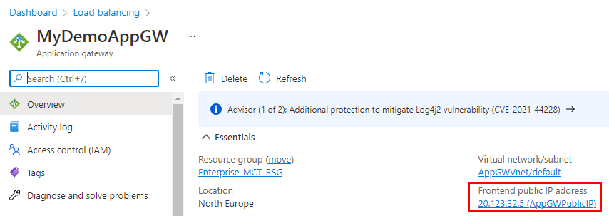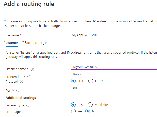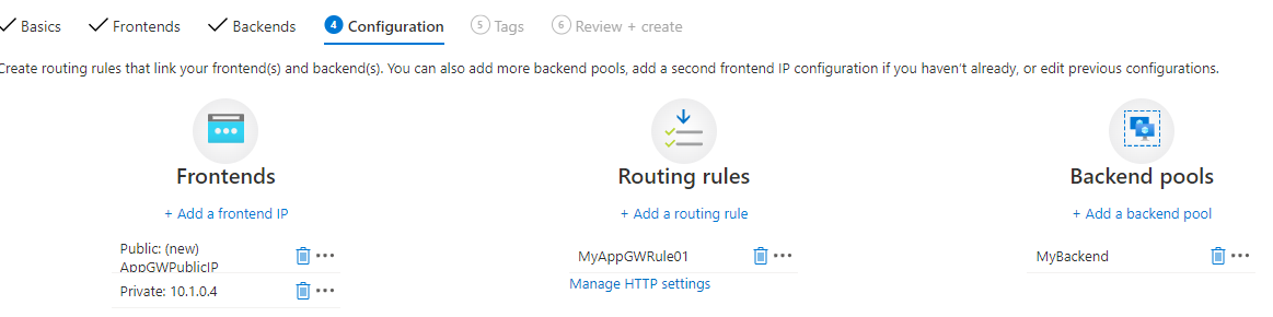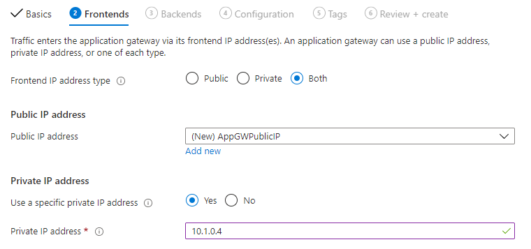 Note! Application Gateways with a tier of Standard_v2 don’t support only private IP addresses as the frontend. Supported SKU tiers are standard and WAF.