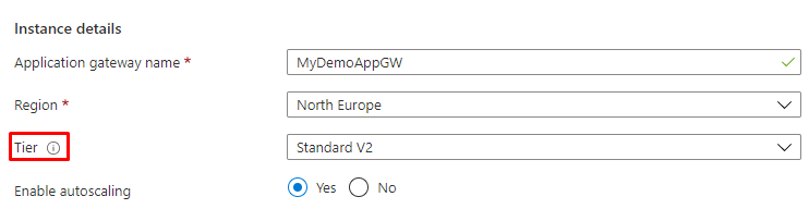 For the Tiers: The v2 tiers offer performance enhancements and support for some critical new features. Choose a WAF tier to support Web Application Firewall on this application gateway. You can upgrade to a WAF tier after the application gateway has been created.