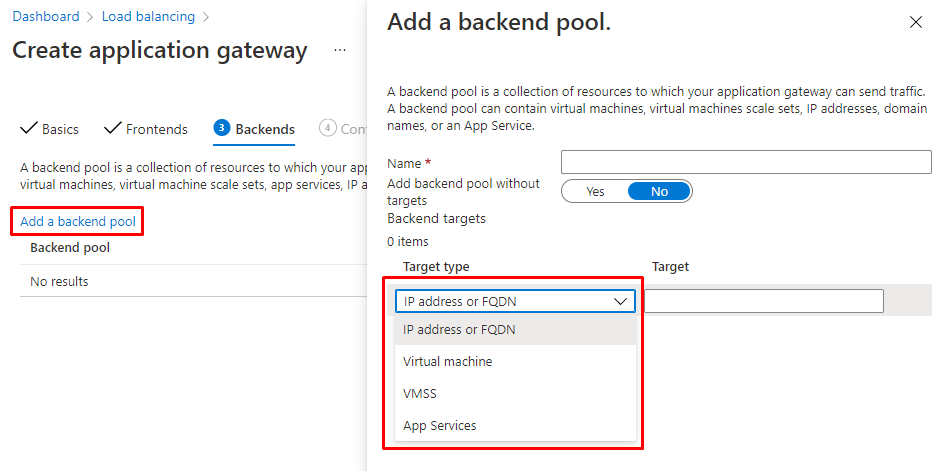 A backend pool is a collection of resources to which your application gateway can send traffic. A backend pool can contain virtual machines, virtual machine scale sets, app services, IP addresses, or fully qualified domain names (FQDN).