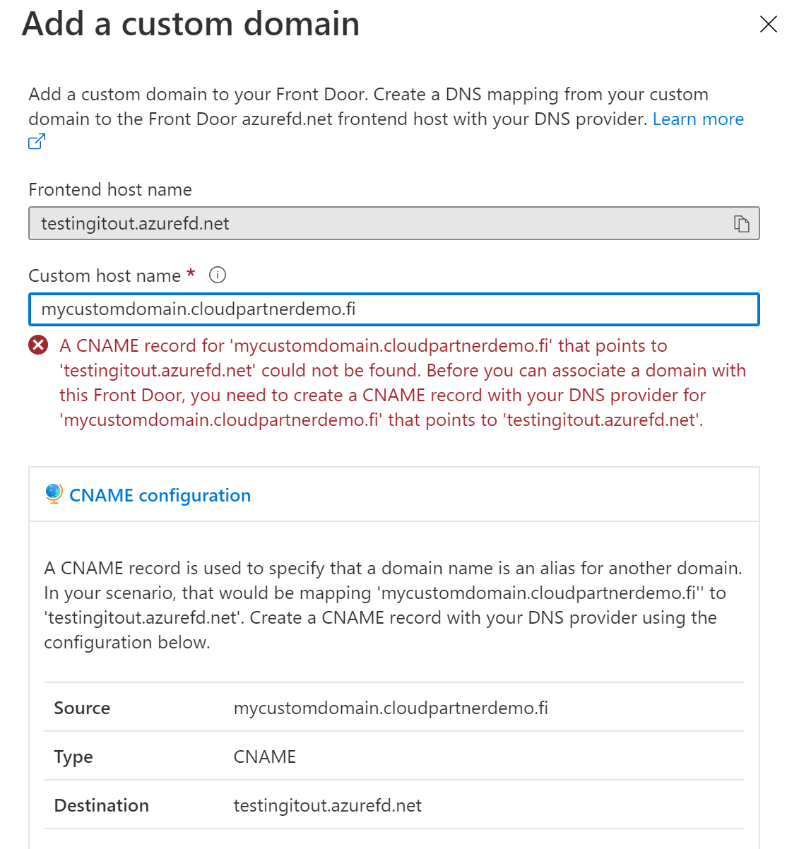 If you want to use a custom domain, you will add it to frontend pool and you have to add an cname that points to your adf domain, like so.
