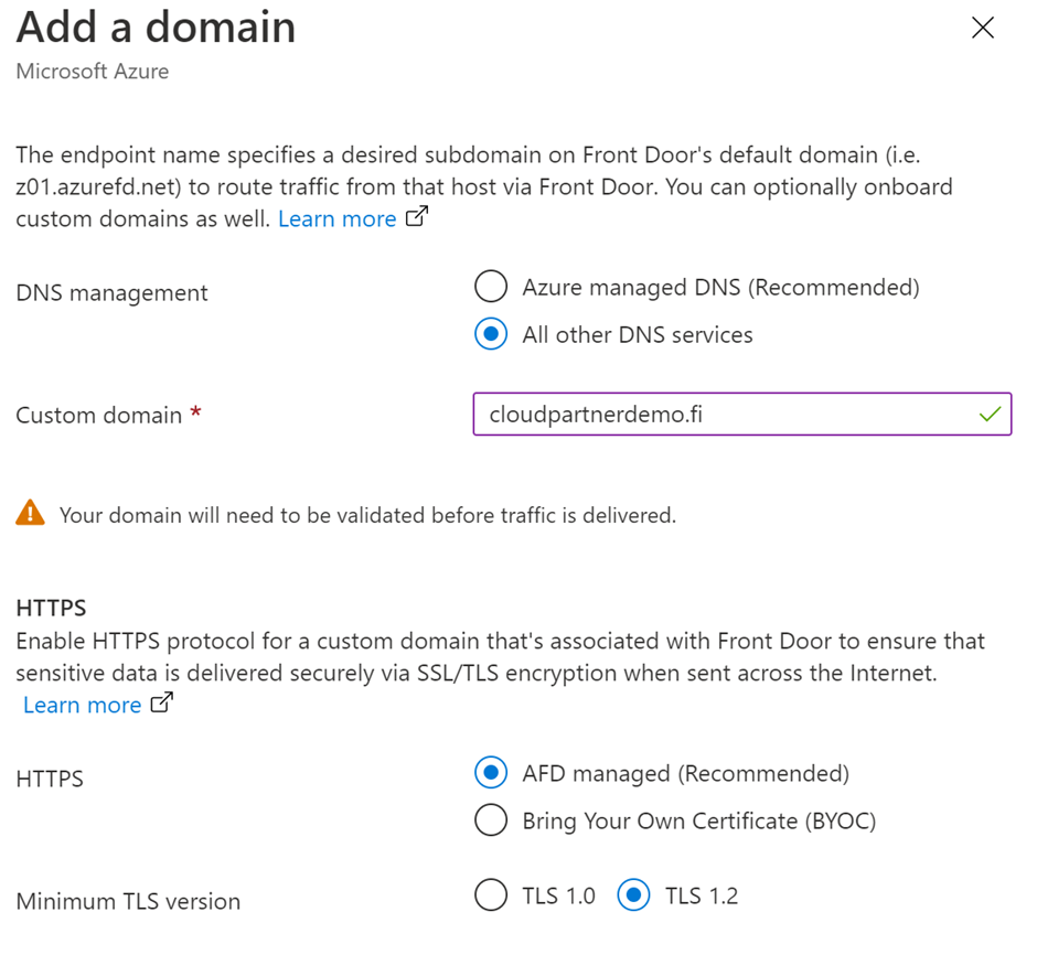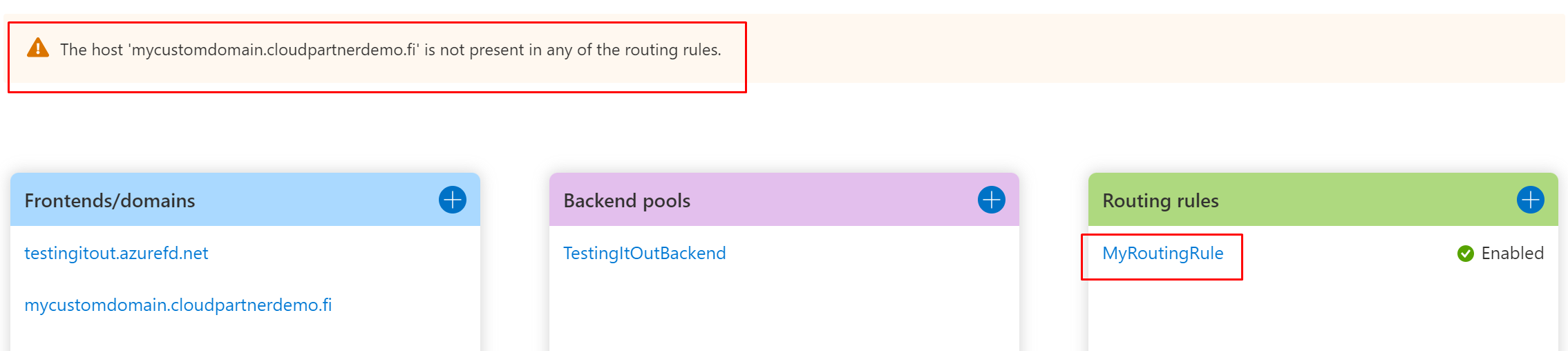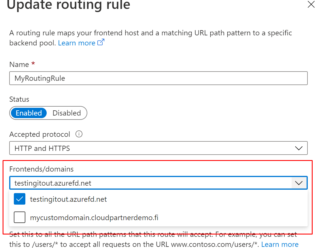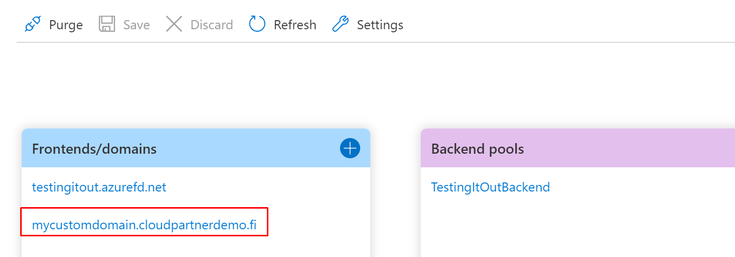 The next thing is to add the custom domain to your routing rule. Open and expand frontends / domains and select custom domain.