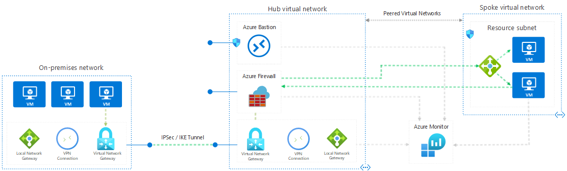A hub-spoke network topology is a way to isolate workloads while sharing services such as identity and security. The hub is a virtual network (VNet) in Azure that acts as a central point of connectivity to your on-premises network. The spokes are VNets that peer with the hub. Shared services are deployed in the hub, while individual workloads are deployed as spokes.