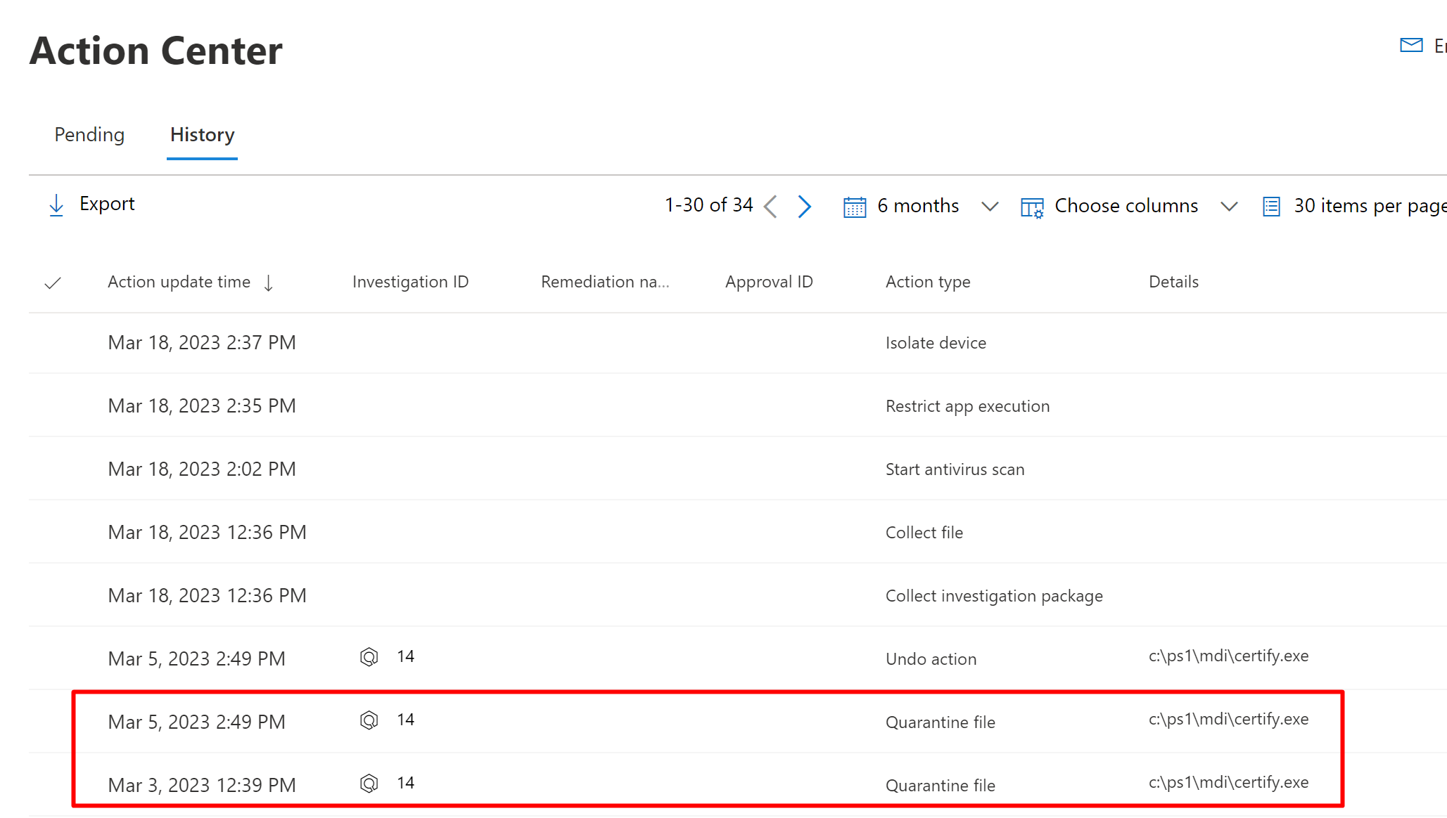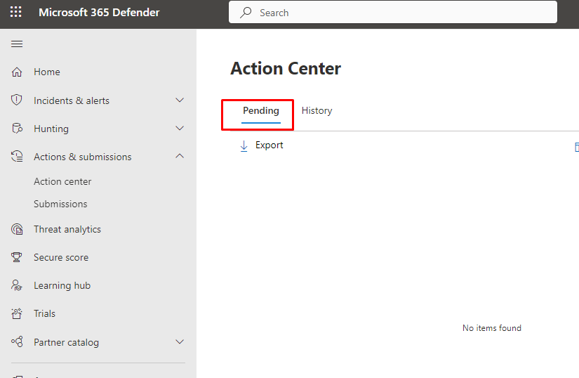 | Pending actions history | Lists items that require approval to proceed. Go to the Action center (https://security.microsoft.com/action-center) to approve pending actions. |