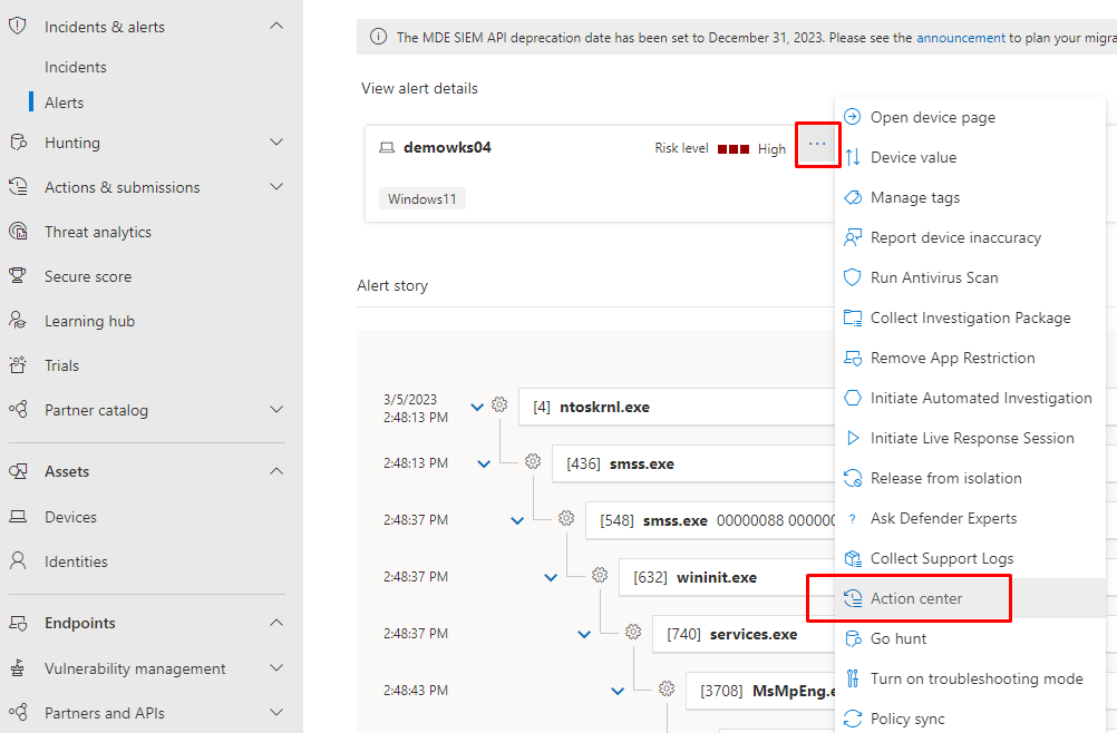 Manage investigation and remediation actions in the Action Center