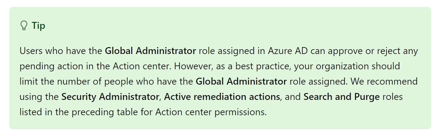 | Microsoft Defender for Office 365 remediation (Office content and email) | Security Administrator role assigned in either Azure AD (https://portal.azure.com) or the Microsoft 365 admin center (https://admin.microsoft.com) --- and --- Search and Purge role assigned in the Microsoft 365 Defender > Email & collaboration roles IMPORTANT: If you have the Security Administrator role assigned only in the Microsoft 365 Defender > Email & collaboration roles, you will not be able to access the Action center or Microsoft 365 Defender capabilities. You must have the Security Administrator role assigned in Azure AD or the Microsoft 365 admin center. |