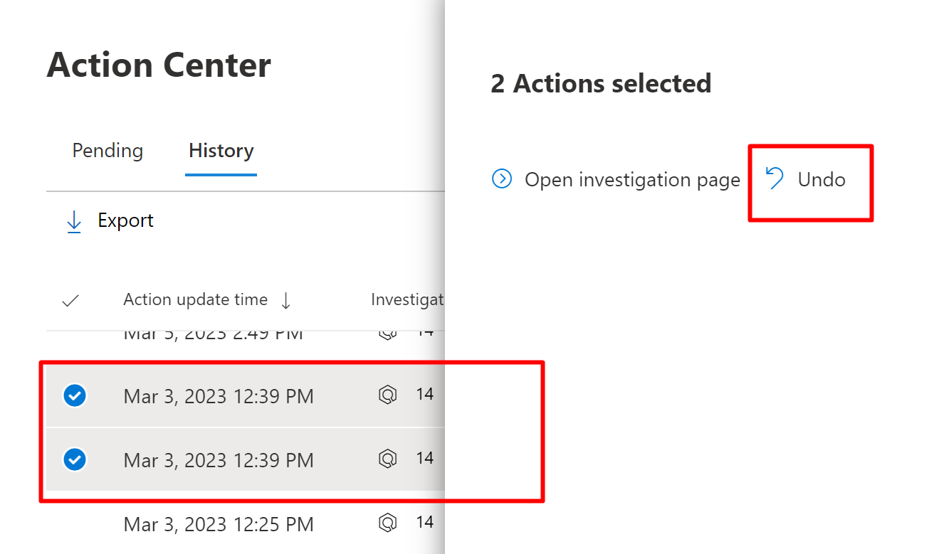 | History | Serves as an audit log for actions that were taken, such as: - Remediation actions that were taken as a result of automated investigations - Remediation actions that were taken on suspicious or malicious email messages, files, or URLs - Remediation actions that were approved by your security operations team - Commands that were run and remediation actions that were applied during Live Response sessions - Remediation actions that were taken by your antivirus protection Provides a way to undo certain actions (see Undo completed actions). |