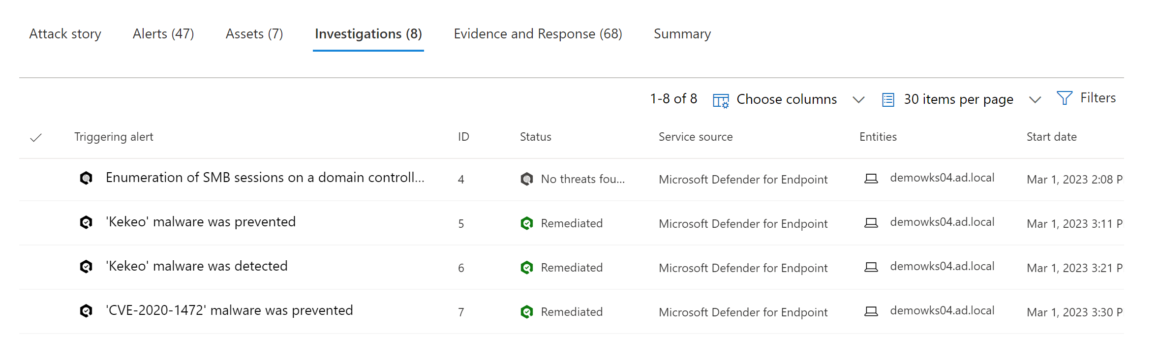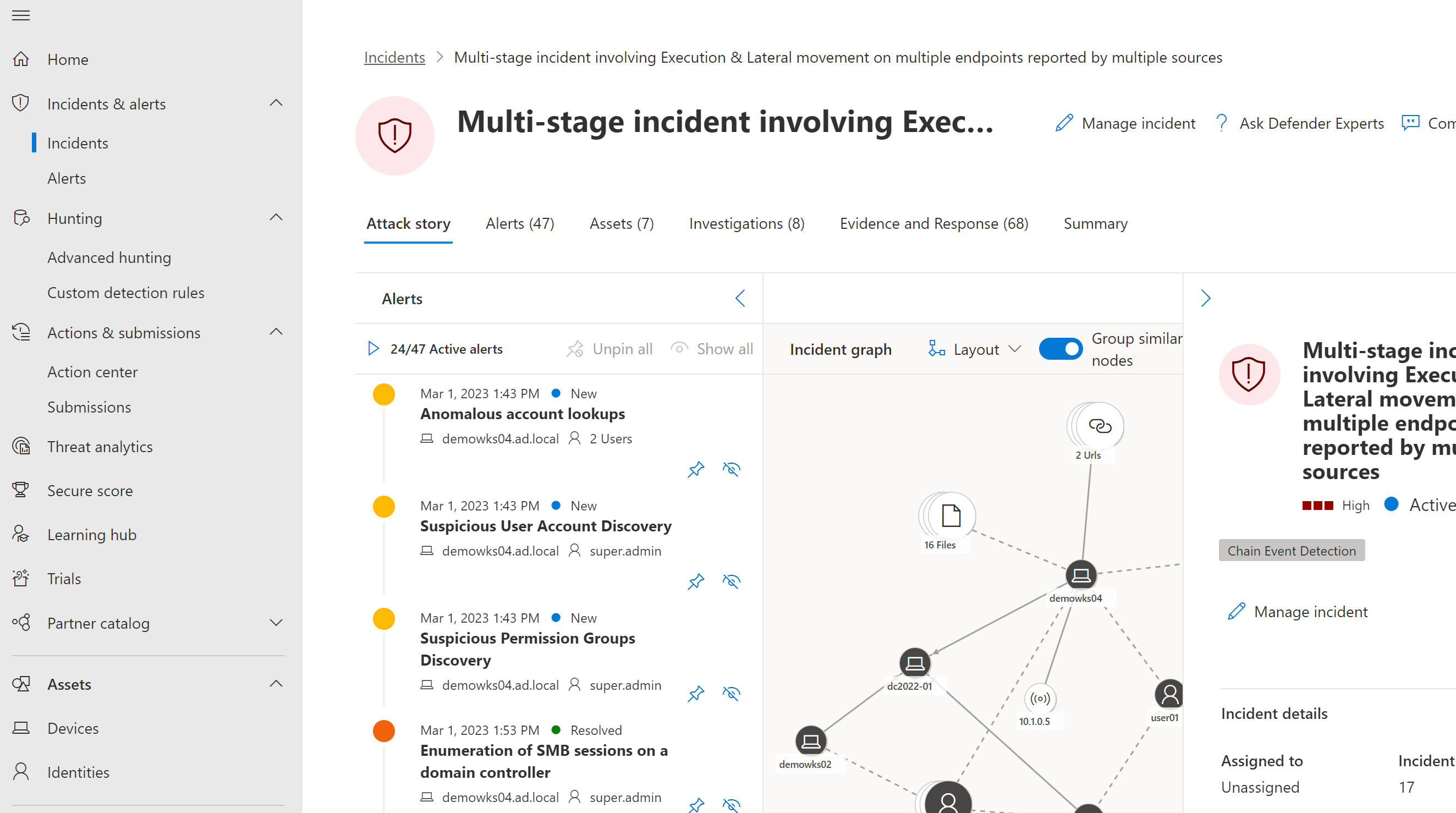 Once you click the incident, you can see the attack story and the investigations.