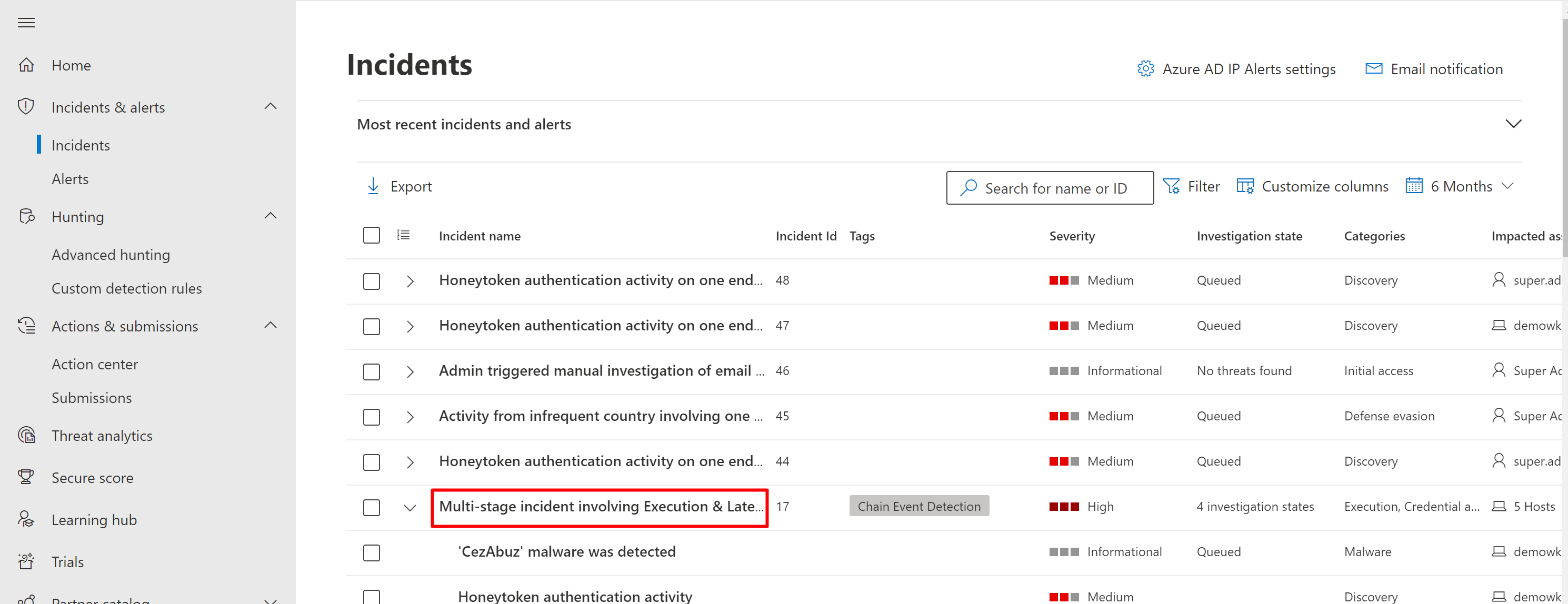 View detailed information about an incident on an incident details page, including any triggered alerts and information about any affected devices, user accounts, or mailboxes.
