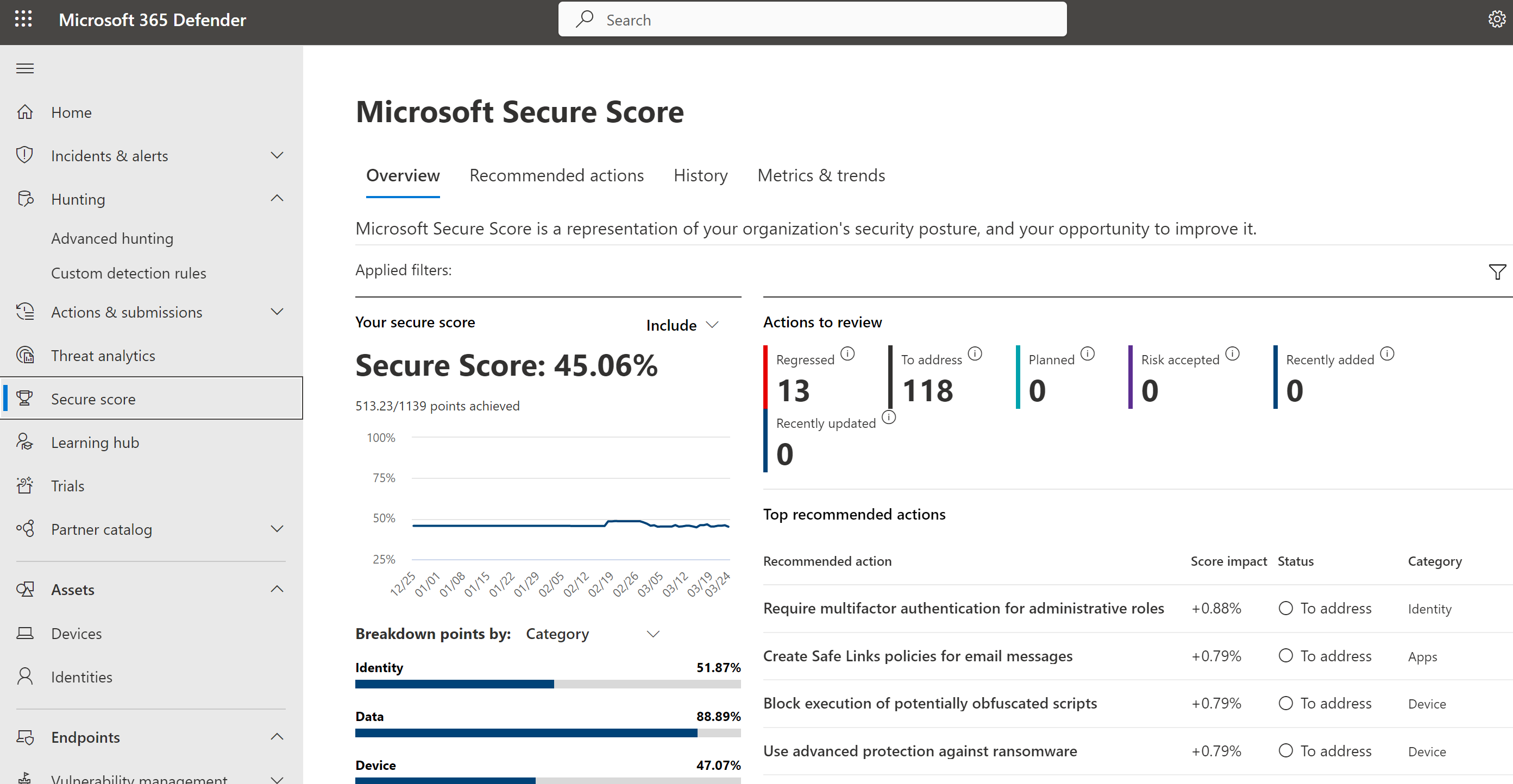 Following the Secure Score recommendations can help to protect your company from threats. Organizations can monitor and work on the security of their Microsoft 365 identities, apps, and devices from a centralized dashboard in the Microsoft 365 Defender portal.