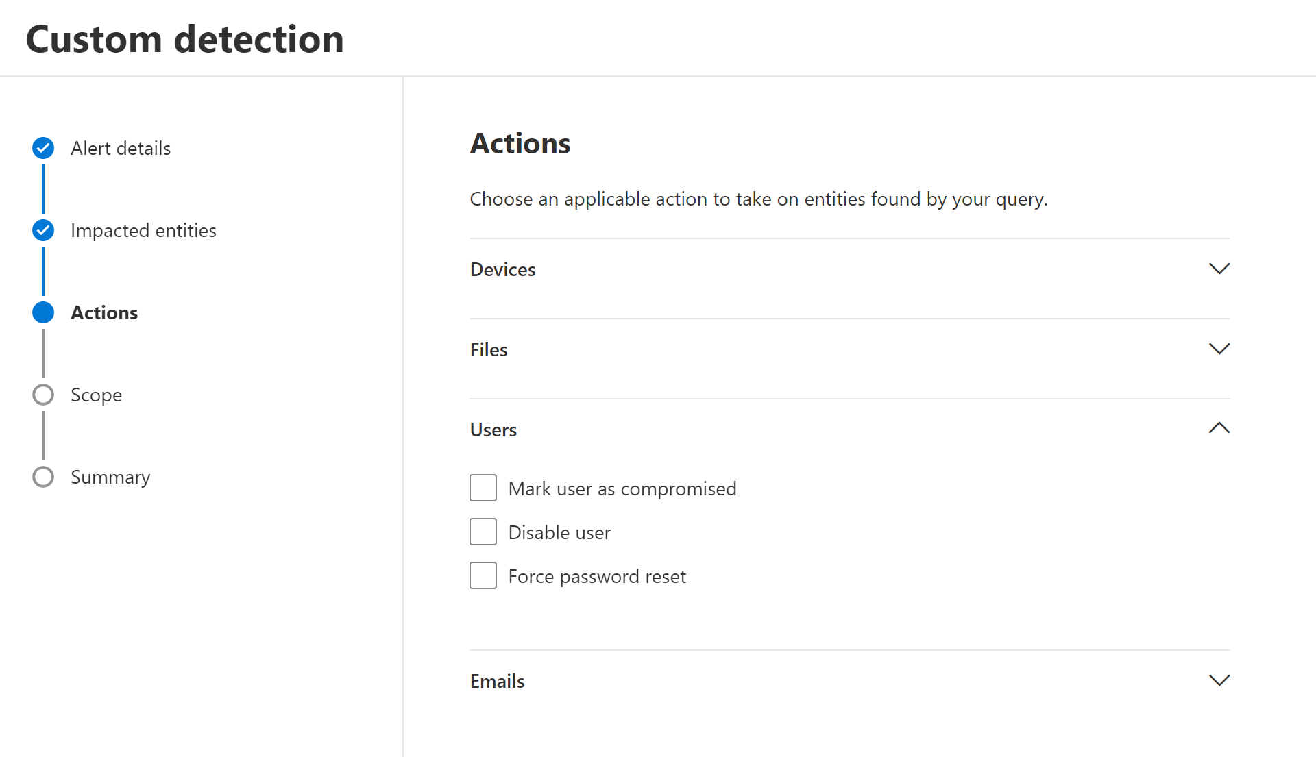 And press next to select your action based on the detection. In example for the user we can to the following.